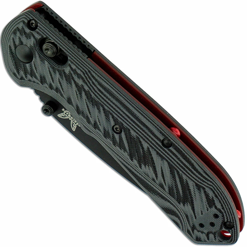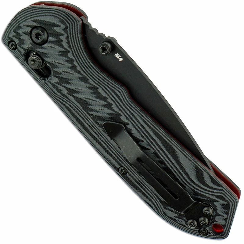 The 560BK-1 Benchmade Freek Knife, the latest iteration of the popular Freek EDC, features a 3.60 inch drop point blade made of CPM M4 super steel, .114 inches thick, with a Rockwell hardness of 62-64. The blade has a non reflective black finish, a notched thumb ramp for secure grip, and dual thumb studs for ambidextrous one hand opening. The gray and black G10 handle, 4.86 inches closed, has a red base layer and red anodized aluminum spacers for visual interest, milled texturing for secure grip, sturdy AXIS Lock, a lanyard hole, and a side to side reversible steel pocket clip mounted at the butt end. The Benchmade Freek M4 Knife has an overall open length of 8.46 inches, and it weighs 4.30 ounces. Proudly made in the USA.