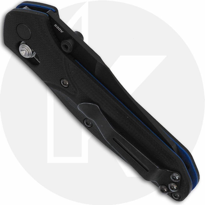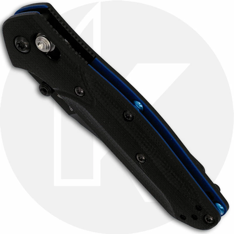 A diminutive take on a Benchmade Classic! The 945BK-1 Benchmade Mini Osborne Knife, designed by Warren Osborne, features a 2.92 inch reverse tanto blade made of CPM S30V stainless steel, .104 inch thick, with a Rockwell hardness of 58-60. The blade has a non reflective black finish, a top swedge to lessen weight and dual thumb studs for ambidextrous one hand opening. The black G10 handle, 3.84 inches closed, has milled contours for ergonomic grip, contrasting blue base layer for visual interest, sturdy AXIS Lock, and a side to side reversible pocket clip mounted at the butt end. The Benchmade Mini Osborne has an overall open length of 6.76 inches, and it weighs 2.19 ounces. Proudly made in the USA.
