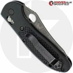The illustrated MODIFIED Benchmade Knife is the Benchmade Griptilian Knife, designed by Mel Pardue. This MODIFIED Griptilian knife features an ACID STONEWASHED 3.45″ modified sheepfoot blade made of S30V stainless steel, .115″ thick, with a Rockwell hardness of 58-61. The ACID STONEWASHED blade of this Benchmade knife has a hollow grind, a notched thumb rest for secure grip, and a blade hole for ambidextrous one hand opening. The black Noryl GTX and Valox handle, 4.62″ closed, has double stainless steel liners, ambidextrous AXIS lock and a lanyard hole. A side to side reversible steel pocket clip is mounted at the butt end of this Benchmade knife. The Benchmade Griptilian Knife with modified sheepfoot blade has an overall open length of 8.07″, and weighs 3.25 ounces. Made in the USA.