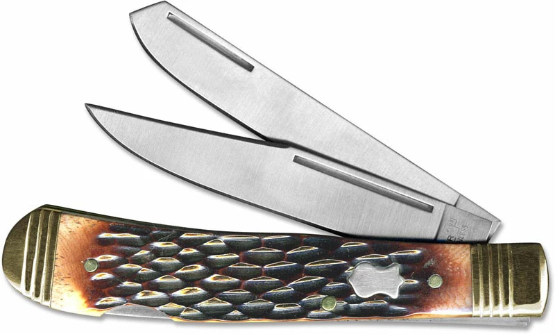 The illustrated Boker Knife is the Boker Plus Double Lock Trapper Knife that features locking clip and spey blades made of 440 stainless steel, with long pull nail nicks for easy opening. The Jigged Brown Bone handle of this Boker Knife, 4 1/4″ closed, has brass liners, classic heraldic shield, scored stainless steel bolsters and a double lockback. The Boker Double Lock Trapper Knife with Brown Bone handle is imported from China.