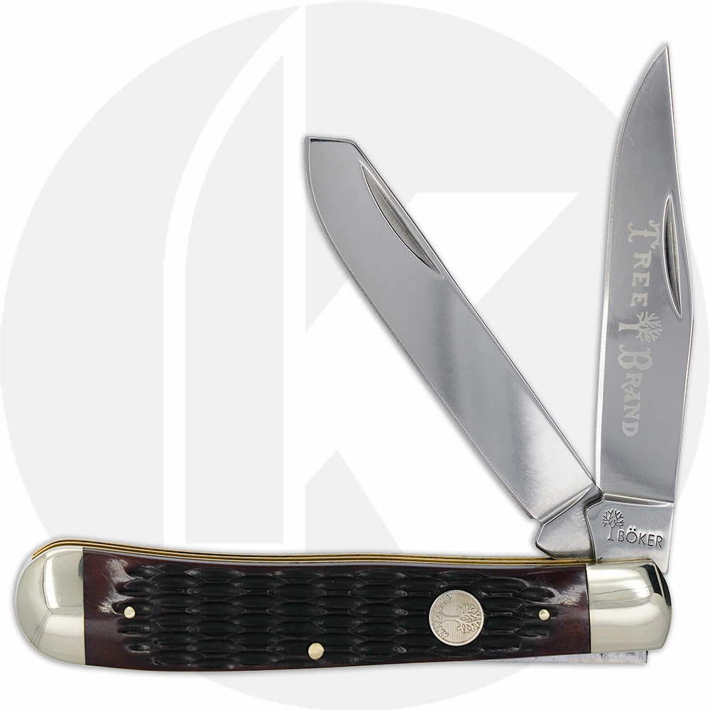 The 110812 Boker Trapper Knife, part of the Boker Traditional Series 2.0, is a classic value price pocket knife that features clip and spey blades made of tough D2 tool steel with nail nicks for opening. The jigged brown bone handle, 4 1/4 inches closed, has brass liners, round Tree Shield and nickel silver bolsters. The Boker Trapper Knife weighs 3.7 ounces. Imported from Germany.