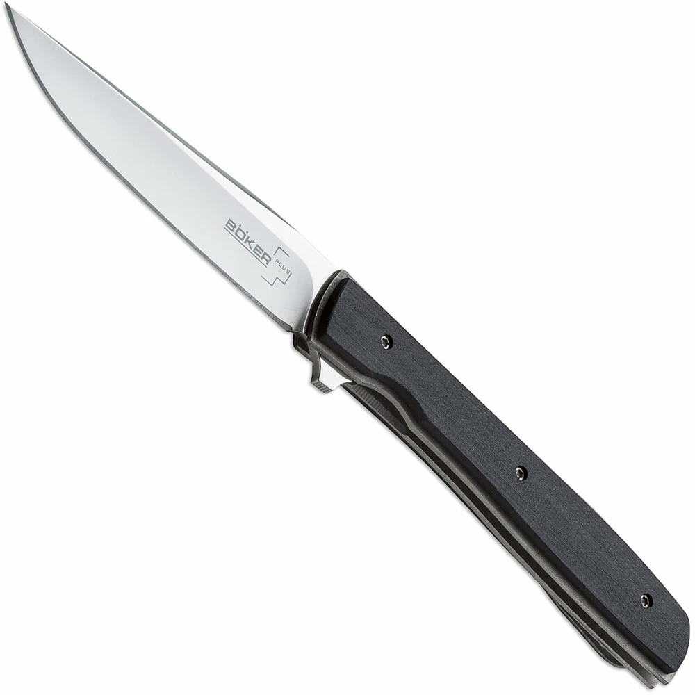 The illustrated Boker Knife is the Boker Plus Urban Trapper Knife, designed by Brad Zinker, that features a 3 1/2″ clip point blade made of VG10 stainless steel. The blade of this Boker Knife has a satin finish, a flipper and IKBS (Ikoma Korth Bearing System) for smooth ambidextrous one hand opening. The titanium handle, 4 1/4″ closed, has a stonewash finish, black G10 scales and a liner lock. A low carry stonewashed metal pocket clip is mounted at the butt end of this Boker Knife. The Boker Plus Urban Trapper Knife with black G10 handle scales has an overall open length of 7 3/4″, and it weighs 1.8 ounces. Imported from China.