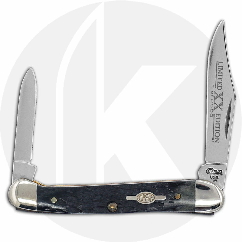 The 04972 Case Limited Edition IV (62109XSS) Mini Copperhead Knife features a clip blade with Limited XX Edition embellishment and a pen blade made of mirror polished Tru-Sharp Surgical steel, with nail nicks for opening. The Rogers Jig Pitch Black Bone handle, 3 1/8 inches closed, has a Case Saturn Shield and nickel silver bolsters. The Case Mini Copperhead Knife weighs 1.4 ounces. Discontinued item, limited to 2500 pieces, BNIB; made in the USA.