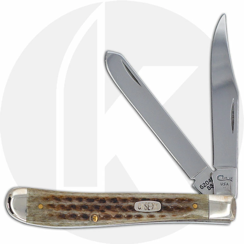 The 00808 Case Pocket Worn Green (62048SS) Slimline Trapper Knife features clip and spey blades made of mirror polished Tru-Sharp Surgical steel with nail nicks for opening. The Corn Cob Jig Pocket Worn Green Bone handle, 4 1/8 inches closed, has the Oval Case XX Shield and nickel silver bolsters. The Case Slimline Trapper Knife weighs 2.3 ounces. Discontinued item, BNIB; made in the USA in 1997.