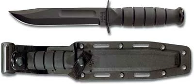 The illustrated KABAR knife is the Short Black KA-BAR Fighting Utility Knife that features a 5 1/4″ 1095 Cro-Van high carbon steel clip point blade with epoxy powder coat and blood groove. Oval Kraton G thermoplastic elastomer handle with powdered metal butt cap and carbon steel guard (butt cap and guard are powder coated). A hard plastic sheath is included with this KABAR Knife. The Short Black KABAR Fighting Utility Knife has an overall length of 9 1/4″, and it weighs .40 pounds.