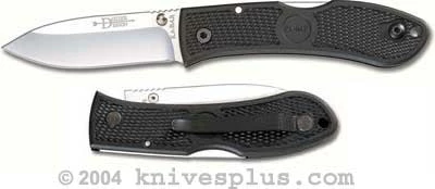 The illustrated KABAR knife is the KABAR Dozier Folding Hunter, designed by Bob Dozier, that features a 3″ drop point blade made of AUS8A stainless steel, with a Rockwell hardness of 56-58. The blade of this KABAR knife has a high hollow grind, the Dozier Design logo, a notched thumb rest, and a reversible thumb stud for one hand opening. The slim black Zytel handle, 4 1/4″ closed, has checkering for secure grip, and a lockback. A side to side reversible metal pocket clip is mounted at the butt end of this KABAR knife. The KABAR Dozier Folding Hunter has an overall open length of 7 1/4″.