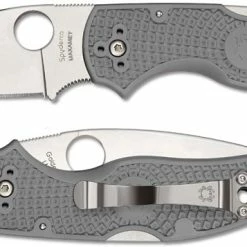 The illustrated Spyderco Knife is the Spyderco Native 5 Knife that features a 2.95″ leaf shaped blade made of Micro Melt Maxamet steel, .125″ thick. The blade of this Spyderco knife has a flat grind, a notched choil and thumb rest for secure grip, and the Spyderco hole for ambidextrous one hand opening. The gray FRN (fiberglass reinforced nylon) handle, 4.0″ closed, has Bi-Directional Texturing, a lockback and a lanyard hole. A four position steel pocket clip is included with this Spyderco Knife. The Spyderco Native 5 Knife with Maxamet steel blade has an overall open length of 6.95″ and it weighs 2.5 ounces. Made in the USA.