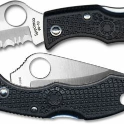 The illustrated Spyderco Knife is the Spyderco Ladybug 3 Knife that features a 1.93″ serrated blade made of VG10 stainless steel. The blade of this Spyderco knife has a Spyderco hole for ambidextrous one hand opening, and a notched thumb ramp for secure grip. The contoured black fiberglass reinforced nylon handle, 2.48″ closed, has a Boye Dent lockback and lanyard/keyring hole. No pocket clip. The Spyderco Ladybug 3 Knife has an overall length of 4.41″ when open, and weighs only .06 ounces.