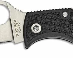 The illustrated Spyderco Knife is the Spyderco ManBug Lightweight Knife that features a 1.88″ blade made of VG10 stainless steel. The blade of this Spyderco knife has a notched thumb ramp and Spyderco hole for ambidextrous one hand opening. The black FRN (fiberglass reinforced nylon) handle, 2.5″ closed, has Volcano Grip texturing for secure grip, a Boye Dent lockback and a lanyard – keyring hole. The Spyderco ManBug Lightweight Knife with plain edge blade has an overall length of 4.37″ and it weighs .65 ounces. Made in Japan.