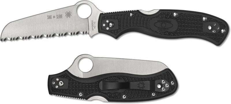 The VG-10 blade of this Rescue 3 Lightweight also combines the enhanced edge geometry of a full-flat grind with the voracious cutting power of Spyderco serrations. To honor the selfless service of first responders, every blade is proudly laser engraved with the motto “Save and Serve.” All other features of these elite knives are consistent with the standard version of this model, including a reliable back lock mechanism, skeletonized stainless steel liners, four-position pocket clip, and Bi-Directional Texturing.