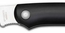 From the Spyderco website: … In essence a highly evolved penknife, the Roadie’s full-flat-ground sheepfoot-style blade features a new “Double Dentâ„¢” for fingernail-free, easy two-handed opening. An improved notched-joint mechanism holds the blade open during use and is backed by a subtle index-finger choil to prevent accidental closure. Contoured fiberglass-reinforced-nylon (FRN) scales and strategically placed jimping (grooves) on the choil and spine provide comfortable ergonomics that enable this knife to perform well beyond its size. …