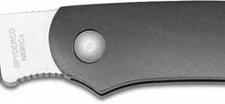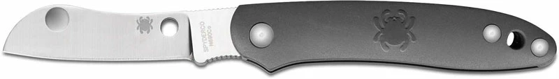 The illustrated Spyderco Knife is the Spyderco Roadie Knife that features a 2.09″ non locking sheepfoot blade made of N690Co stainless steel, .112″ thick. The blade of this Spyderco knife has a flat grind, a notched choil and spine for secure grip, and Double Dent feature for easy two hand opening. The smooth gray (FRN) fiberglass reinforced nylon handle, 2.99″ closed, has Spyderco Bug detailing and a lanyard hole. The Spyderco Roadie Knife has an overall open length of 5.08″, and it weighs 1 ounce. Made in Italy.